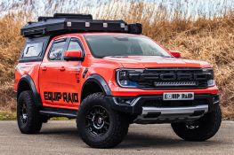 Voici un Ford Ranger Raptor préparé par Equip'Raid avec un Modcap family Alu-Cab, un aménagement intérieur tailgate Gear, des jantes Evo Corse Dakar Zero, ...