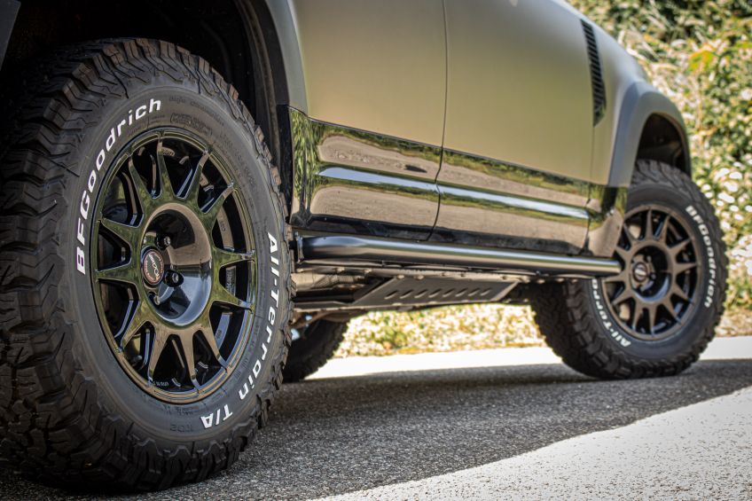 Ces jantes renforcées en aluminium sont conçues à l'origine pour lemilieu de la compétition automobile. Autant vous dire qu'en terme de robustesse et de performance, elles sauront répondre à vos exigences. Montées sur ce Land rover, elles lui ajoutent un petit côté agressif qui lui va bien.