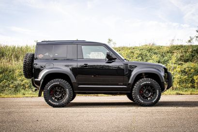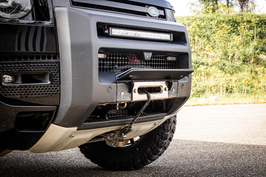 Encore un travail d'adaptation sur ce véhicule, avec cette plaque rabattable que nous avons pu installer sur un parechoc et treuil d'origine Land Rover.