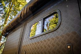 En effet, il s’agit d’un hard-top avec une tente de toit intégrée permettant un accès direct au couchage par le hard-top. L’accès se fait par la porte arrière (qui fait toute la hauteur, du plancher de la benne jusqu’en haut du hard-top). Comme tous les hard-tops Alu-Cab, le Canopy Camper confort est fabriqué en aluminium pour un poids plume et est équipé de portes latérales type « papillon ».
