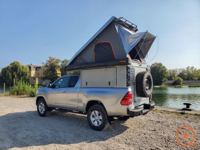 Le Canopy Camper est un Hardtop avec une tente de toit intégrée. Cette dernière bénéficie d'une avancée couvrant la porte arrière permettant ainsi de la laisser ouverte même cas de pluie. Grâce à la porte arrière, vous aurez un accès direct au couchage par le hardtop. La porte arrière, très large, permet un accès aisé à l'intérieur du Camper et la possibilité d'ajouter un porte roue (voir plus bas pour plus de détails).