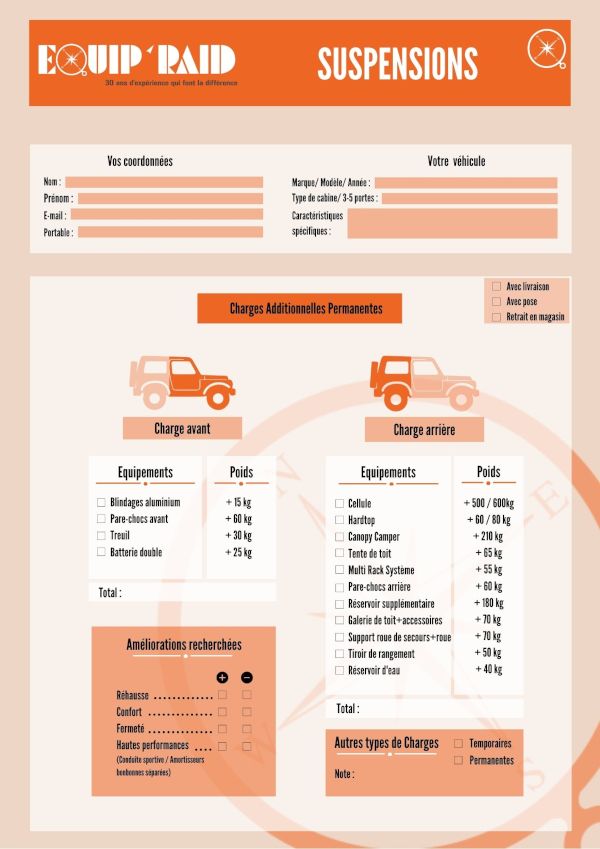 Pour vous aider dans votre choix, Equip’raid vous conseille et vous guide dans le choix de vos suspensions.