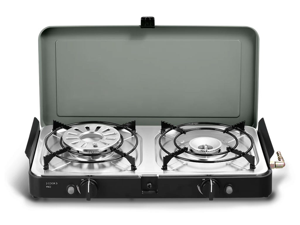 Ce barbecue à gaz léger et élégant comporte deux brûleurs indépendants. Chaque brûleur est doté d'un aluminium moulé interchangeable, d'une grille plate antiadhésive (GreenGrill) et d'une plaque de cuisson. En outre, il est livré avec deux supports de casseroles, un porte-cafetière et un sac de transport. Il est idéal pour tout, du camping au voyage en van, en passant par la cuisine de table lors d'une aventure.
