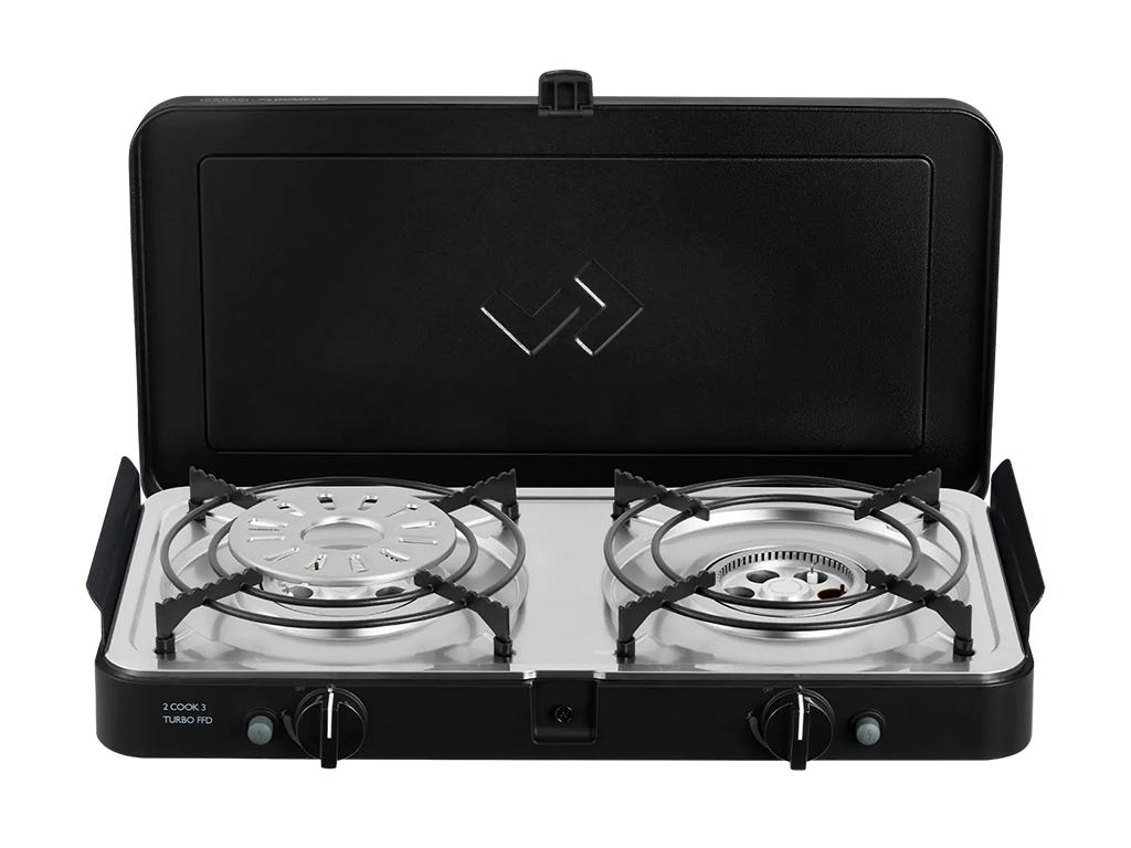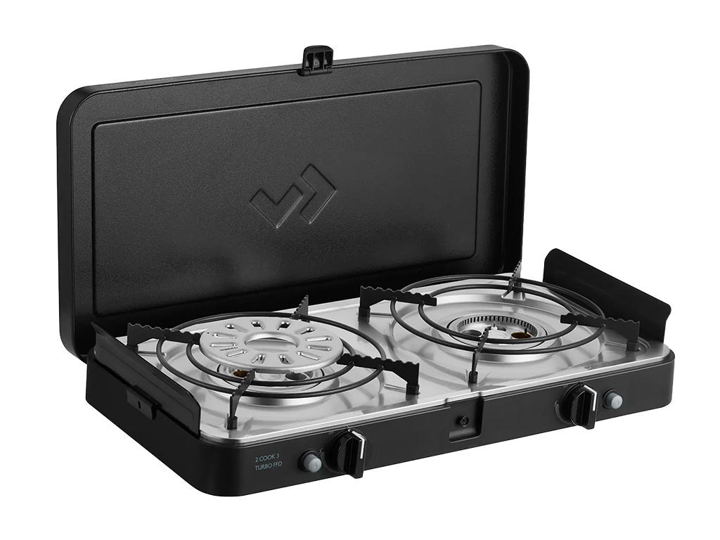 Le 2 Cook Turbo Deluxe FFD / 50mbar fait partie de la gamme de réchauds Turbo de CADAC, qui fournit une chaleur plus concentrée. Le 2 Cook Turbo à double brûleur, facile à utiliser, est l'ultime réchaud à gaz léger pour le camping et l'extérieur. Il est idéal pour toute aventure en véhicule, car vous pouvez préparer une cafetière, faire frire des oeufs ou retourner des crêpes en quelques secondes. Comprend deux supports de casseroles, une plaque plate, une plaque nervurée, un support de cafetière, des pare-brises et une poignée amovible. Le gaz s'éteint automatiquement si la flamme est éteinte.