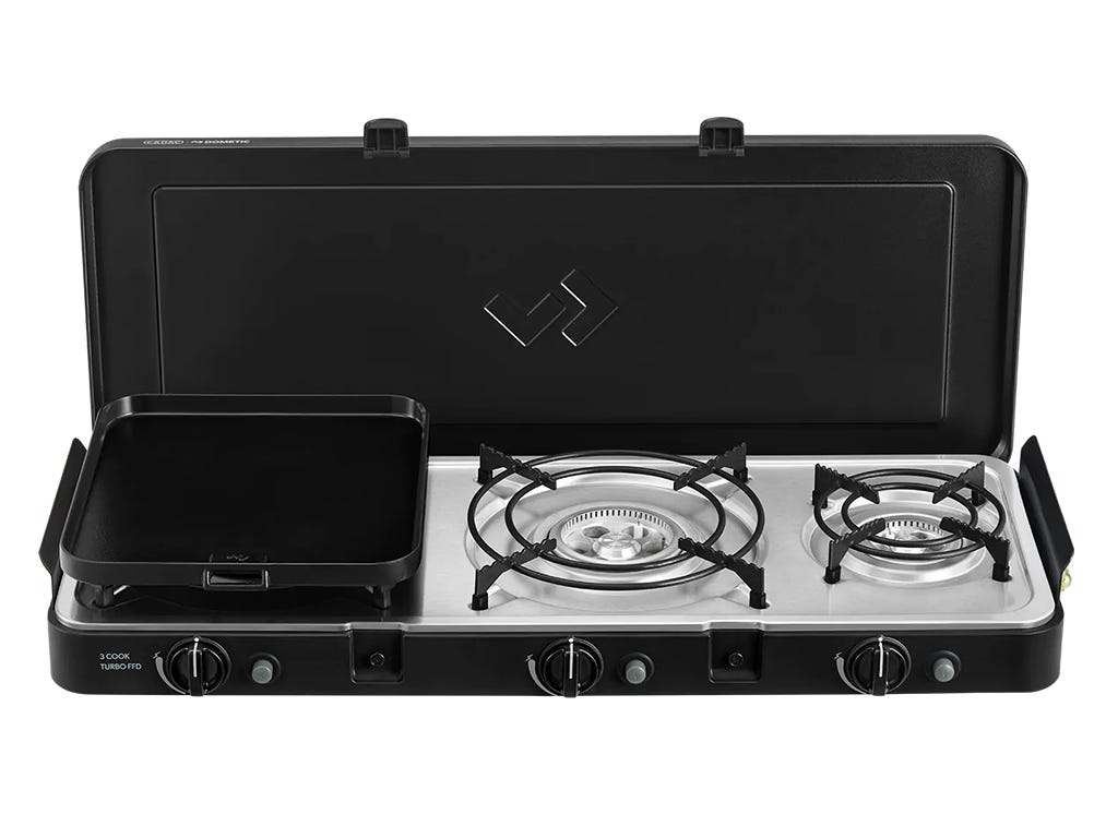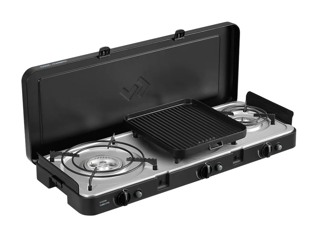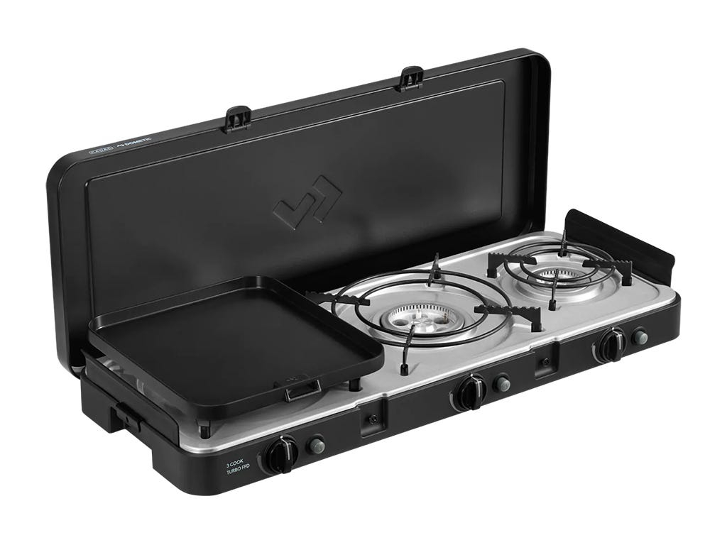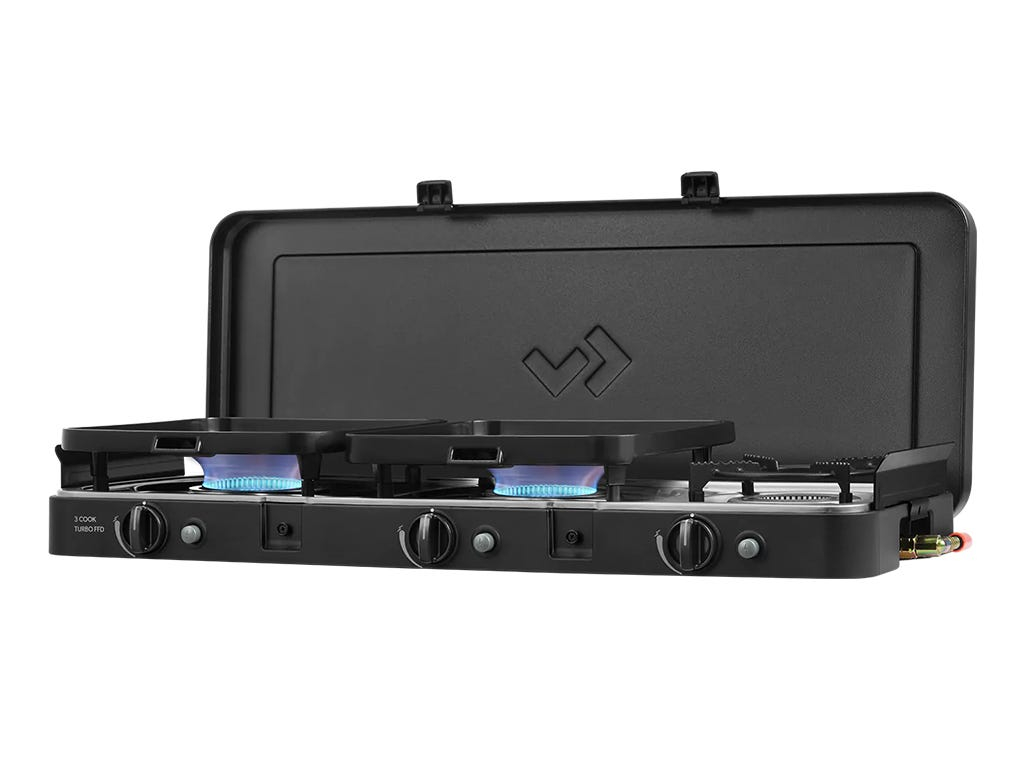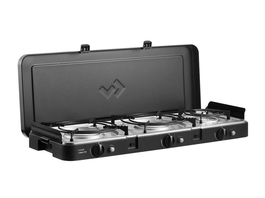 Le 3 Cook Turbo Deluxe / 50mbar dispose de trois brûleurs de haute qualité, ce qui en fait le réchaud à gaz d'extérieur indispensable pour ceux qui doivent préparer beaucoup de nourriture ou pour un grand groupe. Les trois brûleurs du 3 Cook Turbo Deluxe peuvent être utilisés simultanément. Ainsi, pendant que vous attendez que la bouilloire bouillonne, vous pouvez faire frire des oeufs sur un autre brûleur et griller des saucisses sur le troisième brûleur. Chaque brûleur est équipé d'un dispositif d'extinction de la flamme, de sorte que le gaz s'éteint automatiquement si la flamme s'éteint.