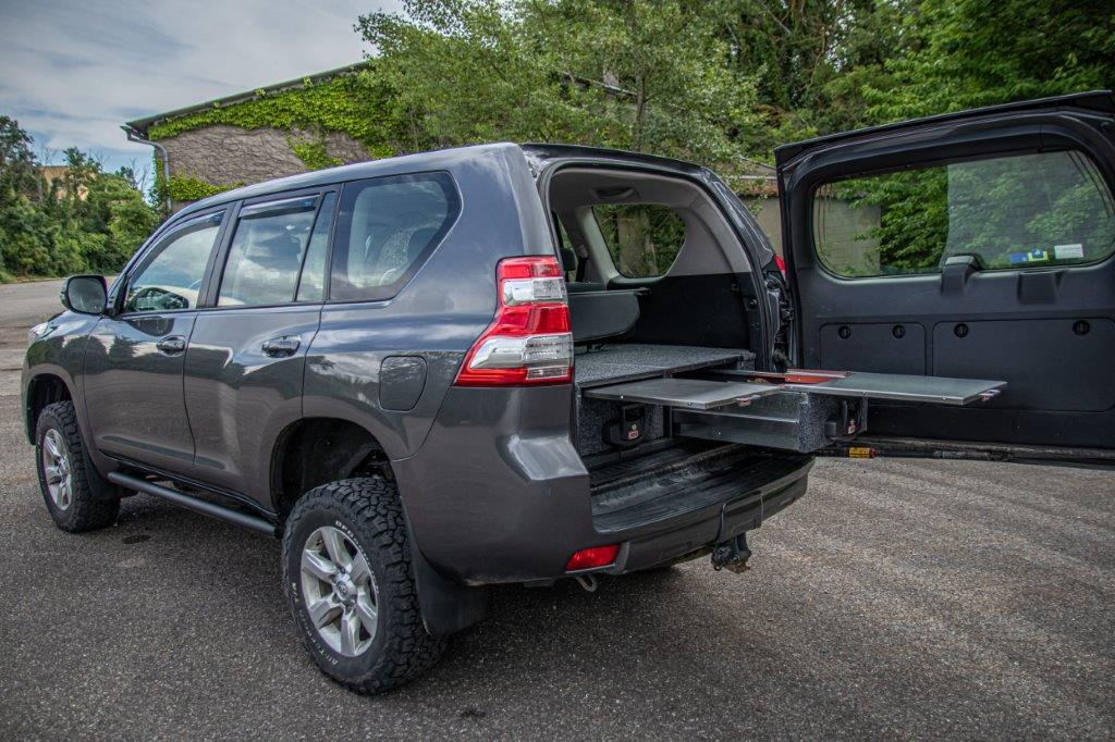 • un tiroir avec couvercle sur glissière : ce tiroir donne un grand espace de stockage et la possibilité de monter un réfrigérateur sur son couvercle, qui pourra être tiré dans et hors du votre véhicule. Contrairement aux autres produits de ce type c'est le seul à avoir une surface complètement plate qui fait que la surface de chargement est optimale si vous n'utilisez pas de réfrigérateur. Dimensions : 945 x 505 x 280 mm