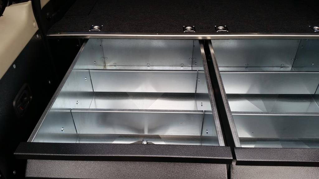 À la place de la banquette arrière, des coffres supplémentaires sont montés, cela permet un ensemble plat destiné à dormir.