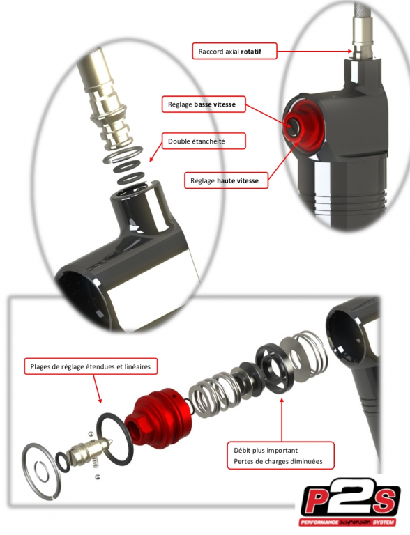 - Amortissement lié à la vitesse de déplacement de la tige, optimisation de la course restituée à basse vitesse permettant un gain de motricité, de confort. Et un meilleur transfert de masse.