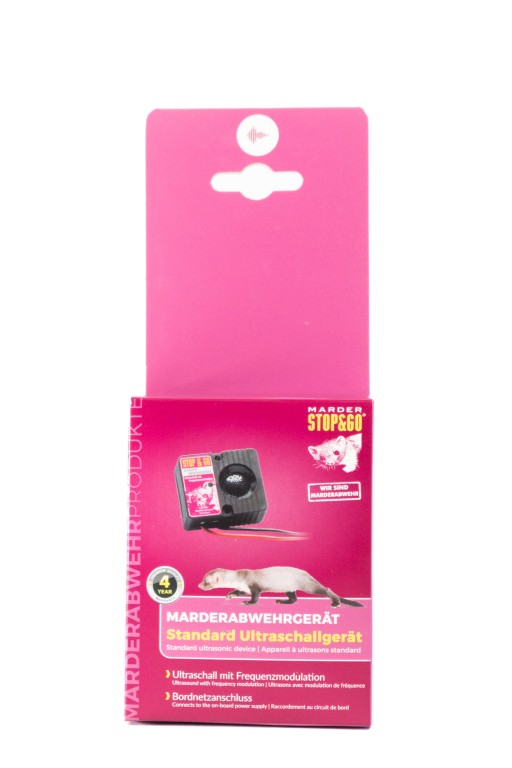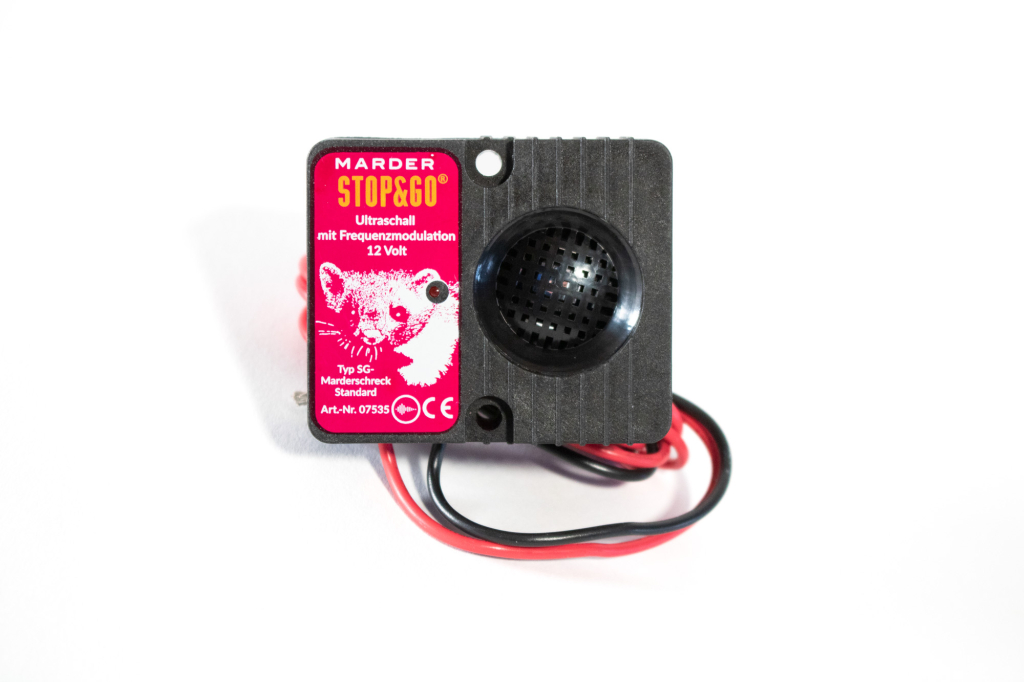 Appareil à ultrasons extrêmement efficace avec haut parleur piézoélectrique résistant à l'eau. Il signale à la martre un danger extrême par des cris de peur et d'alarme émis par les animaux. Aucun effet d'accoutumance.