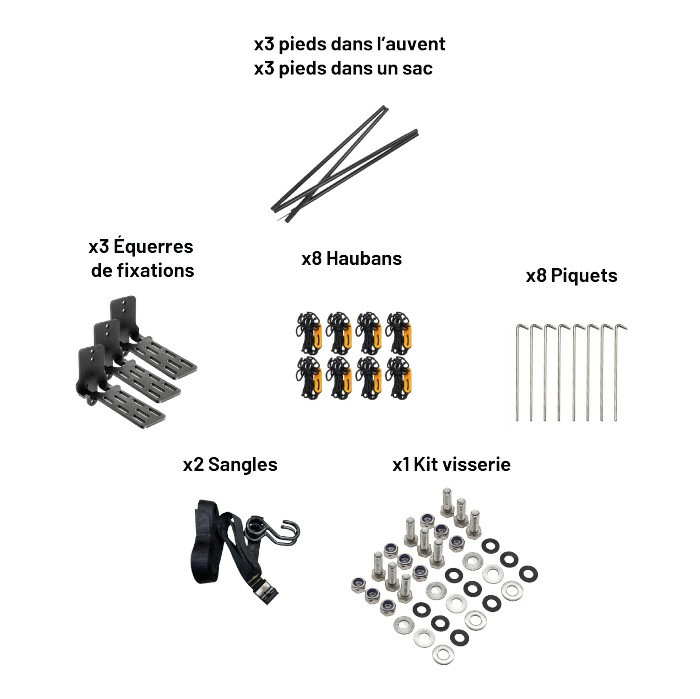 Fournis avec: notice et kits de fixations (pour adapter en fonction du support barres/galerie).