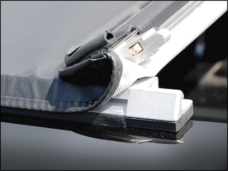 Ouverture et fermeture par un système de clips qui tend parfaitement la bâche