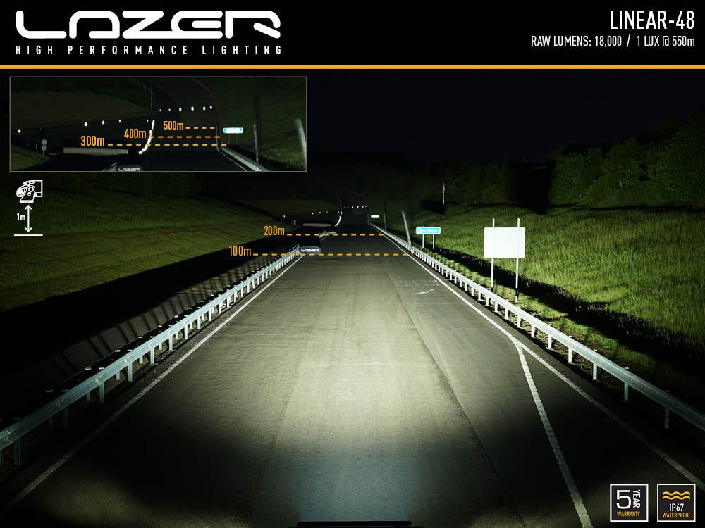 D'une longueur de 1282 mm (51"), le Linear-48 comprend 48 LED haute densité soigneusement sélectionnées pour leur puissance de sortie supérieure, leur température de couleur à 5000 kelvin et leurs performances thermiques (fournissant une longévité améliorée). Émettant un total de 18 000 lumens, la lampe délivre 1 lux à 550 m via des optiques ultra-réfléchissantes métallisées sous vide qui offrent l'équilibre parfait de l'éclairage à distance avec une incroyable répartition de la lumière gauche/droite qui rend la conduite de nuit beaucoup plus agréable. , et sûr, expérience.