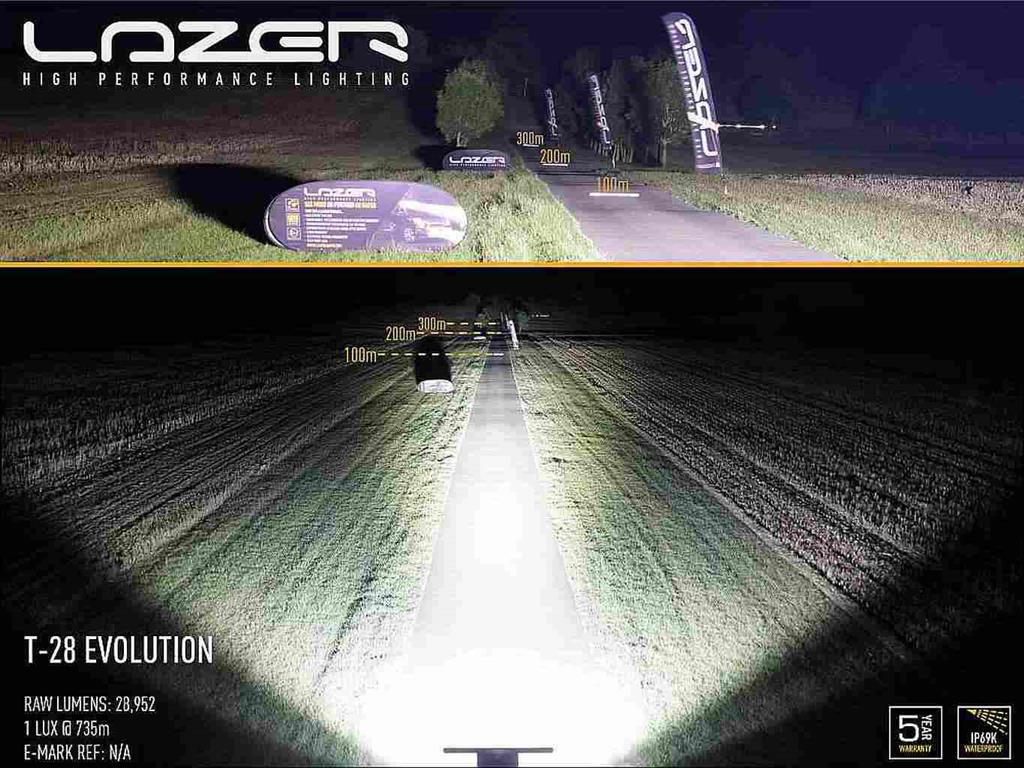 Avec un flux lumineux impressionnant de 28 952 lumens, le phare Lazer Lamps T25 Evolution est aussi puissant que neuf phares de route au xénon ou près de 29 phares de route halogènes H4. La répartition lumineuse hybride assure une excellente portée et un large éclairage sur toutes les plages de distance et offre ainsi au conducteur des conditions de visibilité exceptionnelles dans l'obscurité. La portée est d'env. 1 470 mètres.