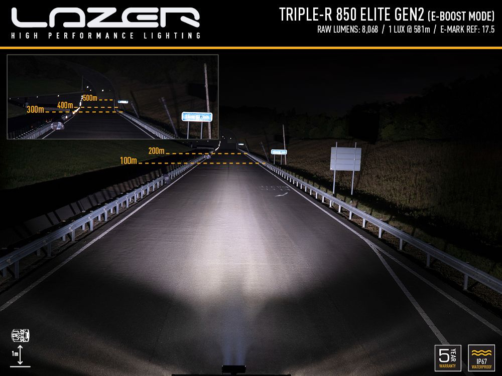 Les modèles Triple-R 750 à Triple-R 1250 sont homologués comme lampes conformément à la réglementation ECE. Unique pour une lampe homologuée, la technologie E-Boost mise en œuvre par les modèles Triple-R Elite (750, 850, 1000 et 1250), une innovation que l'on retrouve dans les lampes Lazer Lamps pour la première fois au monde. En dehors des voies publiques, les lampes peuvent être commutées à pleine puissance en branchant le soi-disant Boost Cap. La portée augmente alors jusqu'à 1500 mètres, selon le modèle. En raison de la configuration flexible des lampes, celles-ci peuvent être utilisées à la fois comme lampes légales et comme faisceaux lumineux à LED. L'installation d'une barre lumineuse supplémentaire peut être omise. Les feux Triple-R avec feu de position sont également homologués comme feux de position et feux conformément à la réglementation ECE.