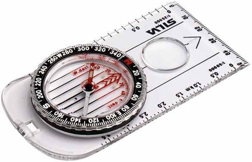 Boussole avec loupe et aiguille lumineuse - Nord en rouge graduation : 360° / 6400 echelles de mesure : 1:25e, 1:50e mm taille : 100 x 54 poids : 37 g garantie : 5 ans