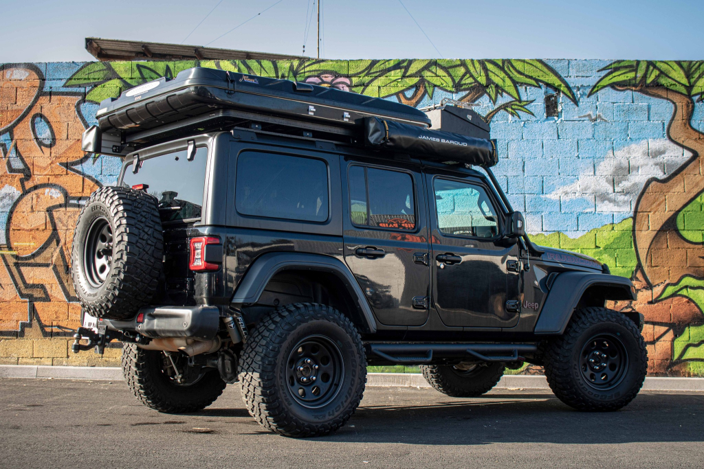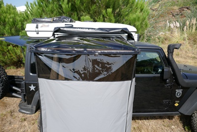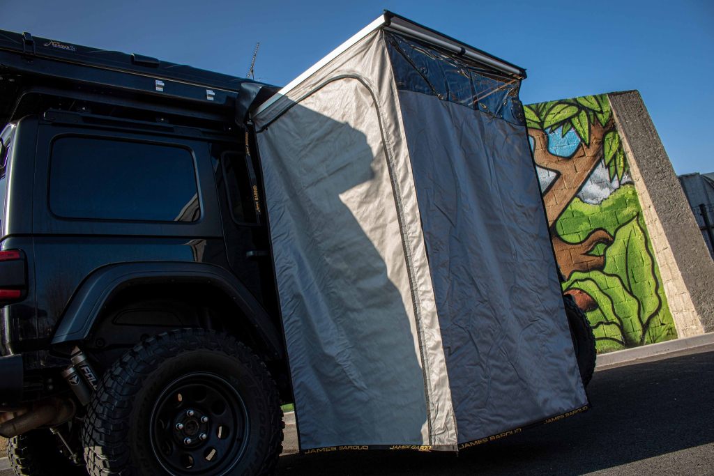 L'abri de douche Falcon de chez James Baroud est fabriquée dans un tissu imperméable anti-UV et plastique souple transparent teinté en noir, traité anti-UV et antistatique.