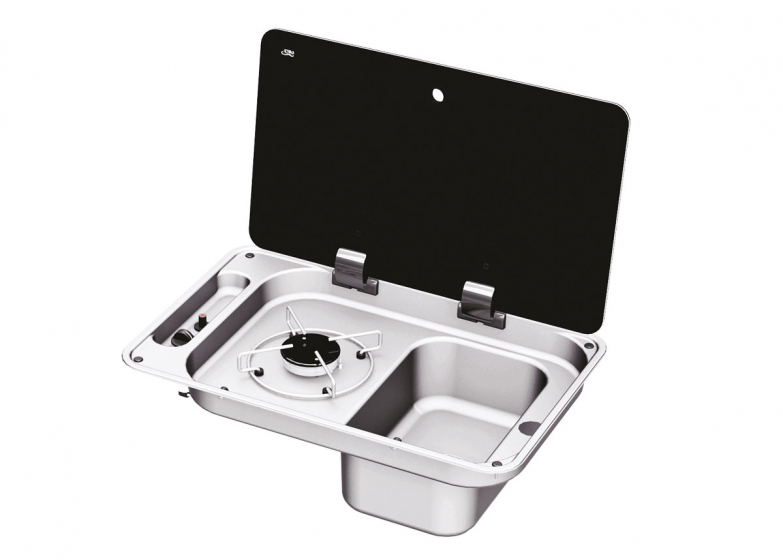 Equipement pour la cuisine des petits camping-cars ou fourgons aménagé, ce combiné réchaud/évier possède des dimensions compactes permettant de l'installer sur de petits plan de travail. De qualité de fabrication CAN, l'ensemble est en inox brillant et doté d'un couvercle verre traité anti-rayures.