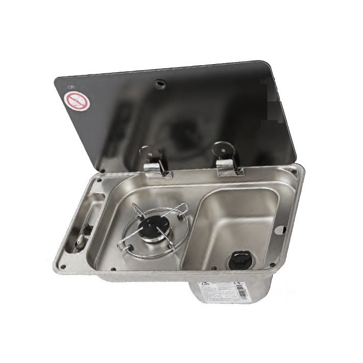 CAN Combiné plan de cuisson à réchaud 1 feu au gaz et évier à cuve inox pour l'aménagement intérieur des camping-cars, fourgons ou bateau. Doté d'un couvercle verre anti-rayures.