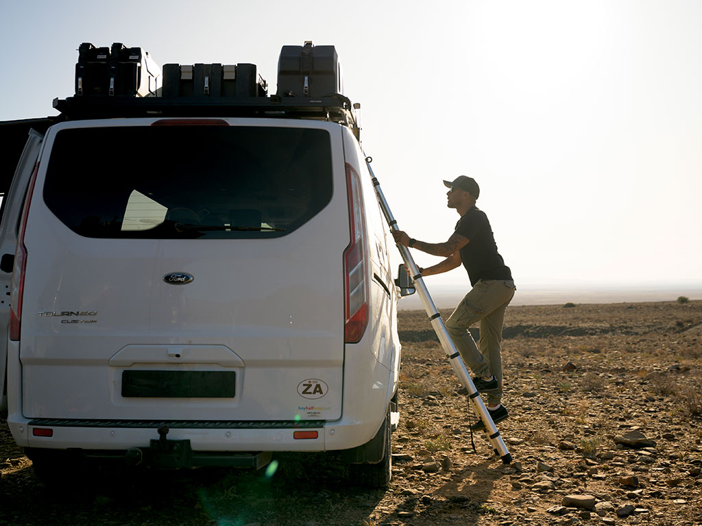 Une échelle télescopique qui s’étend jusqu’à 2,6m. L’échelle a neuf marches pour atteindre le toit de votre véhicule pour charger des objets et de l’équipement sur la galerie.