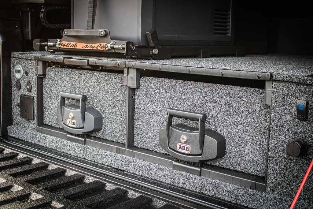 Cet aménagement complet pour Ford Ranger Extra cabine 2023+ se compose de deux tiroirs ARB de 50cm de large chacun pour une longueur de 173cm avec un plateau coulissant pour l'un des tiroirs et un plateau fixe pour le second, ainsi que le kit de finition permettant d'avoir une zone de chargement parfaitement plate dans le véhicule.