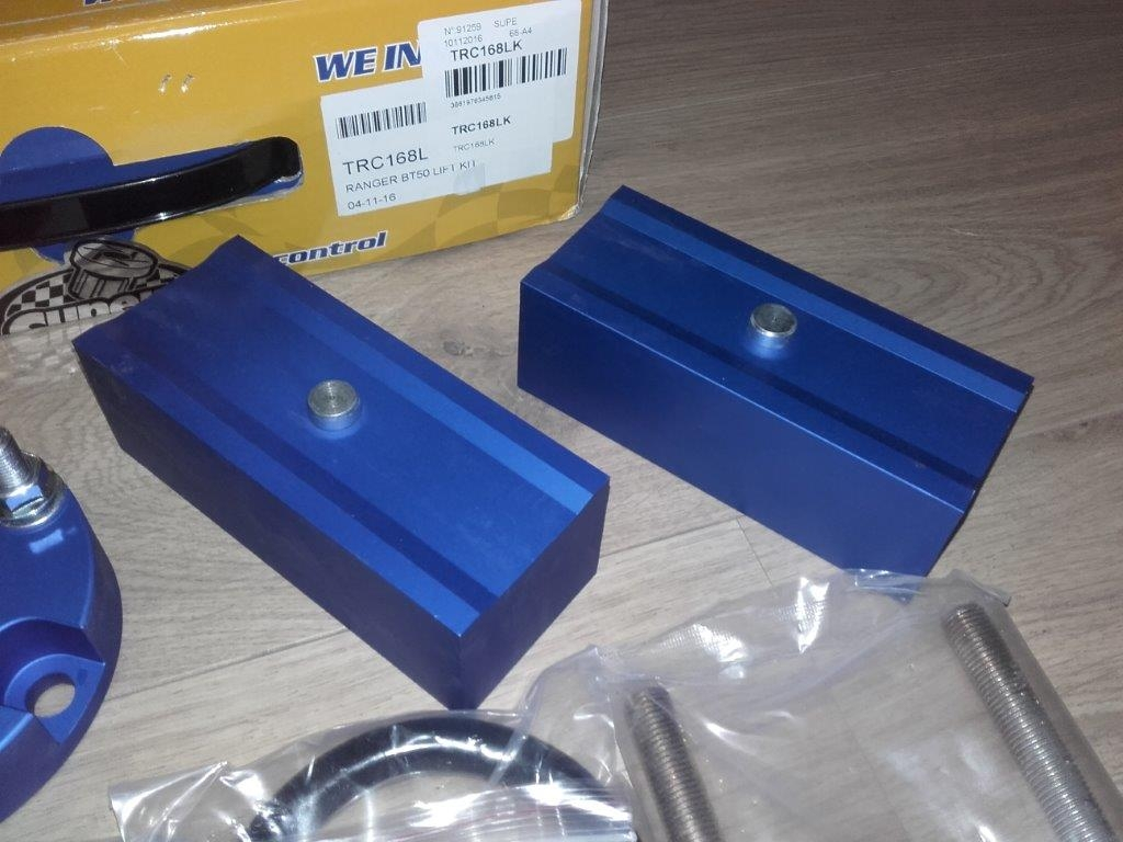 Un kit se compose de 2 cales à boulonner sur les platines d’amortisseurs avant, de 2 cales à insérer entre le pont et les lames de ressorts arrières ainsi que les brides rallongées nécessaires à leurs fixations.