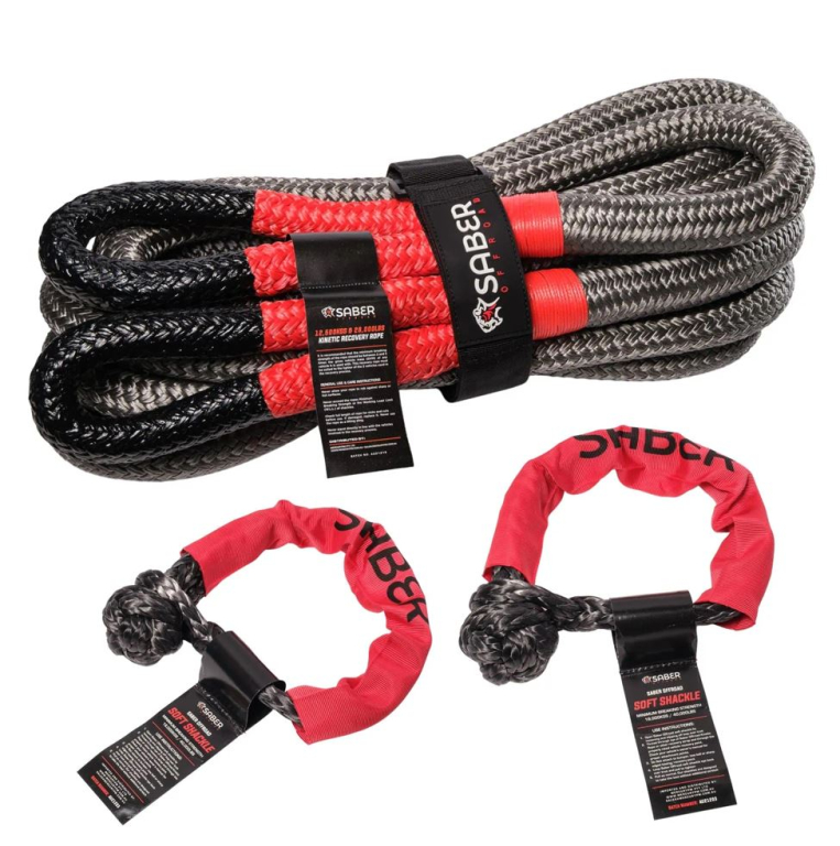 Dans le cadre du Kit de déplantage, Saber Offroad a inclus deux manilles souples de 18 000 kg avec protection. Comme pour les autres produits de la gamme de manilles souples Saber Offroad, ce produit est conçu pour être plus sûr, plus solide, plus léger et plus facile à utiliser que les autres manilles (souples et métalliques).