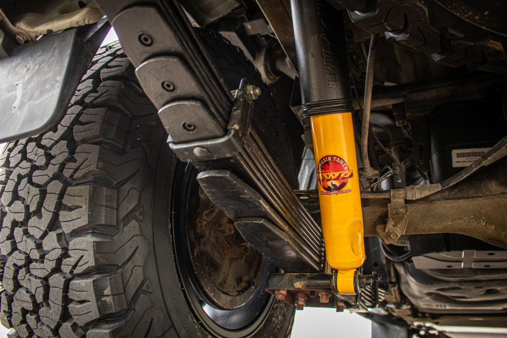 Les kits de suspension Terrain Tamer sont livrés complet, avec les ressorts, les amortisseurs, les lames ainsi que le kit de montage (silent-blocs, brides, axes et jumelles graissable), et l'amortisseur de direction (si disponible pour le véhicule).