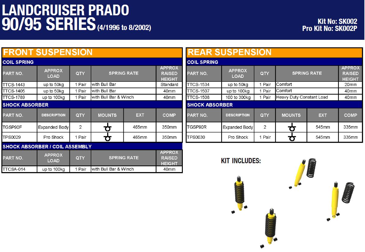 Accueil > Suspension & Rehausse > Kit complet suspension > KIT DE SUSPENSION TERRAIN TAMER AVEC AMORTISSEUR PRO SHOCK REHAUSSE +40/50MM POUR TOYOTA PRADO 90/95