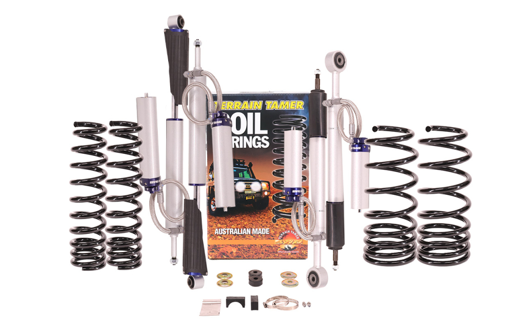 Les kits de suspension Terrain Tamer sont livrés complet, avec les ressorts, les amortisseurs, les lames ainsi que le kit de montage (silent-blocs, brides, axes et jumelles graissable), et l'amortisseur de direction (si disponible pour le véhicule).