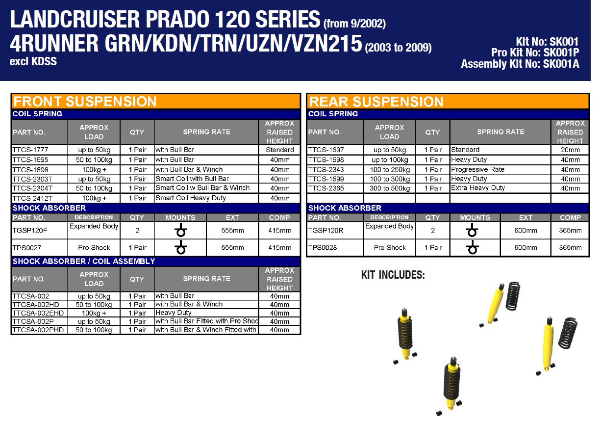 Accueil > Suspension & Rehausse > Kit complet suspension > KIT DE SUSPENSION TERRAIN TAMER REHAUSSE +40/50MM POUR TOYOTA KDJ/GRJ120/125 2002-2008