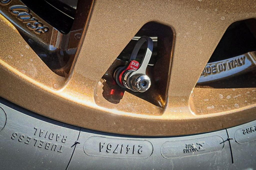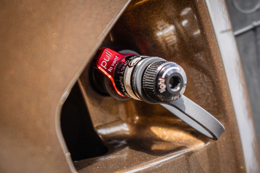 Une fois vos pneus dégonflés et la colerette re-baissée, le bouchon de valve en aluminium sécurise la valve et la colertte.