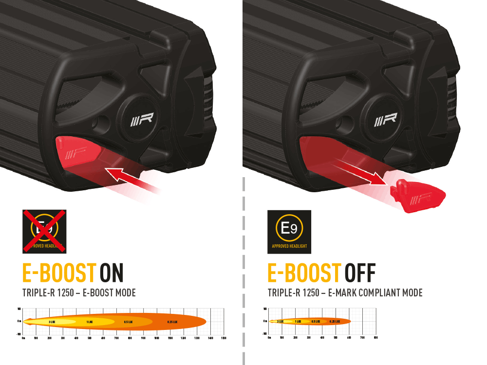 Les modèles Triple-R 750 à Triple-R 1250 sont homologués comme feux de route conformément à la réglementation ECE. Unique pour une lampe homologuée, la technologie E-Boost mise en œuvre par les modèles Triple-R Elite (750, 850, 1000 et 1250), une innovation que l'on retrouve dans les lampes Lazer Lamps pour la première fois au monde. En dehors des voies publiques, les lampes peuvent être commutées à pleine puissance en branchant le soi-disant Boost Cap. La portée augmente alors jusqu'à 1500 mètres, selon le modèle.