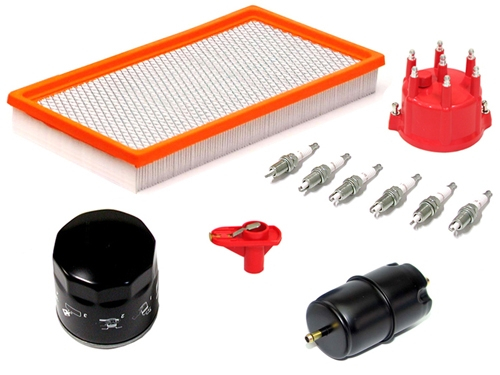 Pour JEEP CHEROKEE XJ 4.0L de 1994 à 2000. Comprenant : bougies d’allumage, tête et doigt de distributeur, filtre à air, filtre à carburant et filtre à huile.