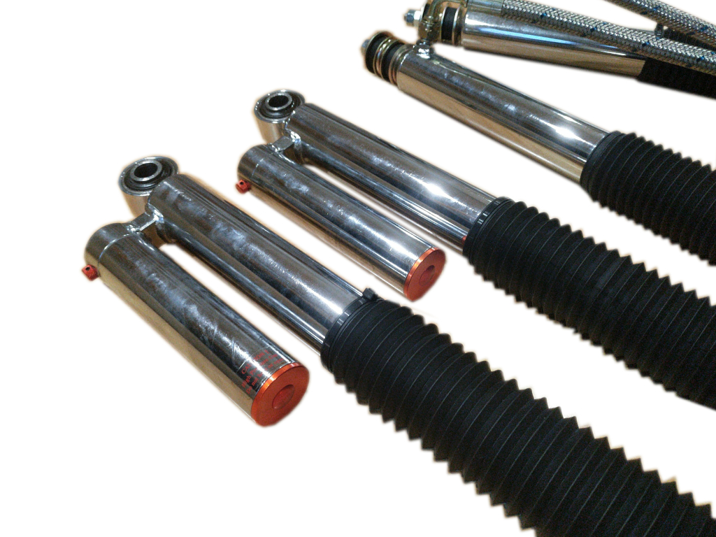 Amortisseurs avant à combiné fileté réglable avec bonbonne séparée et ressorts.