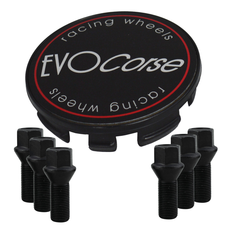 Comprend : 1 enjoliveur en aluminium noir brillant avec badge EVO Corse noir mat un lot de 6 ecrous M14x1.5 noir