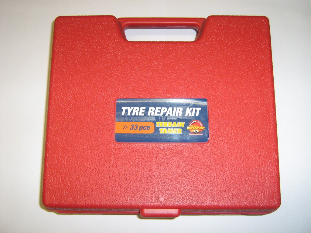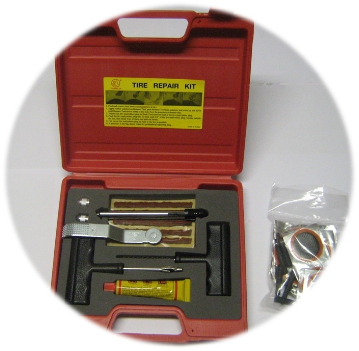 comprenant : * outils de réparation de valve * outils de réparation de pneu * emplâtres de diverses tailles * colles * mèches à pneus tubeless * râpe + roulette * démonte obus * craie