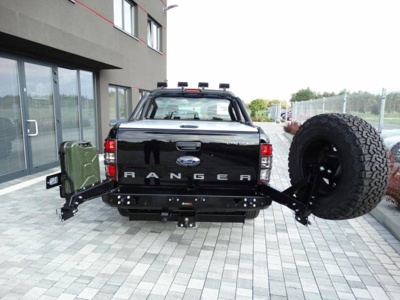Support de roue de secours dédié au pare-chocs F4x4. La structure de montage est en tôle de 3 mm d'épaisseur. Le produit est d'abord découpé au laser, puis plié sur une presse plieuse, et la forme correcte est obtenue lors de la finition manuelle. L'étape suivante est la protection anti-corrosion consistant en l'application d'un apprêt à la poudre de zinc, et la peinture en poudre qui donne au pare-chocs son aspect définitif.