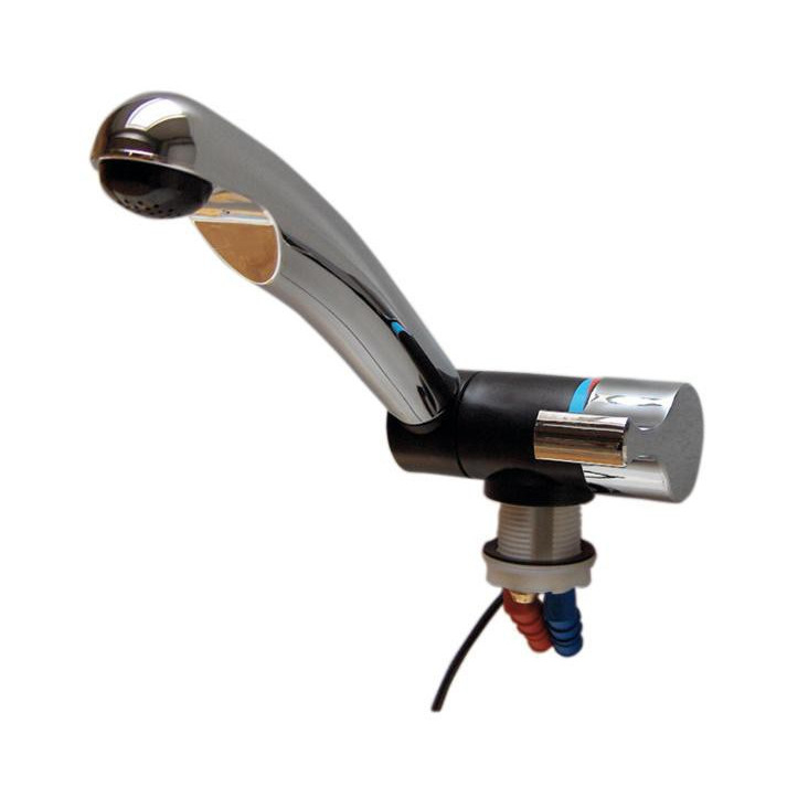 Le robinet mitigeur rabattable REICH est d’un très bon rapport qualité prix, conçu pour une connexion au tuyau eau chaude eau froide de diamètre 10 à 12mm et pour être connecté au câble entre la batterie et la pompe 12V. (Utiliser le câble du contacteur comme interrupteur et non comme câble d’alimentation électrique de la pompe 12V.)