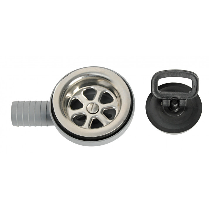 Bonde en plastique haute résistance (moplen) avec grille en INOX Ø 70 mm, sortie à 90° pour limiter l’encombrement sous l’évier au maximum pour lavabo, évier, vasque et combinée réchaud gaz de marques CAN et OSCULATI.