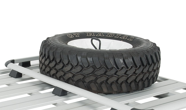 Support de roue de secours RHINO RACK Le support de roue de secours RHINO RACK est idéal pour transporter une roue de secours sur votre galerie. Il est facile à monter et est doté d'un point d'accrochage. Fabriqué en alliage léger Garantie 3 ans
