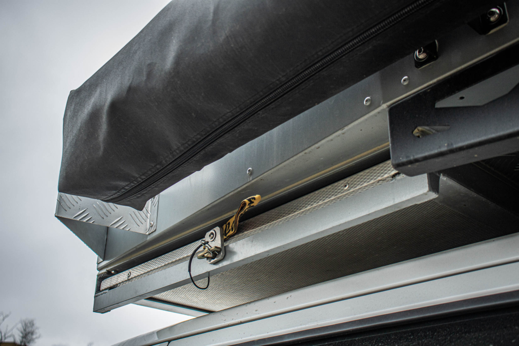 La table peut se ranger au plafond de votre hardtop Alu Cab grâce au système de fixation (système de fixation pour hardtop Alu Cab vendu séparément) ou à l'emplacement prévu sur votre canopy camper Alu-Cab.