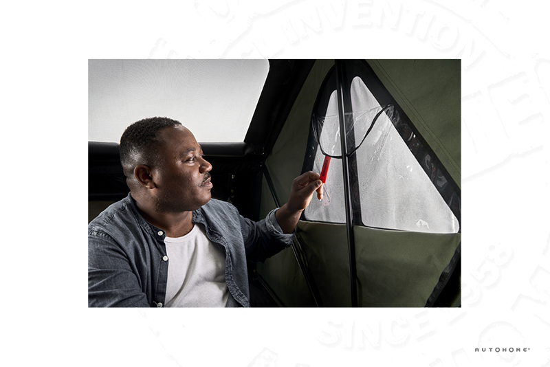Le nouveau toit DOUBLE FACE vous permet d’affronter toutes les conditions météorologiques : il s’ouvre et se ferme facilement tout en restant confortablement allongé dans la tente.